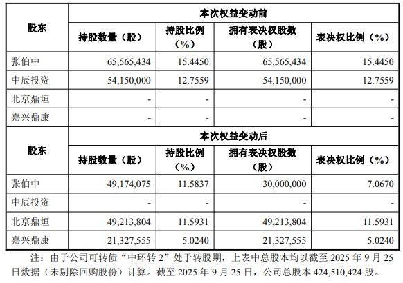 中环环保同日发布的关于控股股东、实际控制人及其一致行动人签署《股份转让协议》暨公司控制权拟发生变更的提示性公告显示,2025年10月9日,中环环保控股股东、实际控制人张伯中及其一致行动人安徽中辰投资控股有限公司(以下简称“中辰投资”)与北京鼎垣企业管理咨询合伙企业(有限合伙)(以下简称“北京鼎垣”)、嘉兴鼎康企业管理合伙企业(有限合伙)(以下简称“嘉兴鼎康”)签署了《股份转让协议》,张伯中将其持有的16,391,359股公司股票(占公司总股本的比例为3.8612%)转让给嘉兴鼎康,中辰投资将其持有的4,936,196股公司股票(占公司总股本的比例为1.1628%)转让给嘉兴鼎康,中辰投资将其持有的49,213,804股公司股票(占公司总股本的比例为11.5931%)转让给北京鼎垣,转让股份合计为70,541,359股(占公司总股本的比例为16.6171%),股份转让单价约为8.48元/股,转让对价合计为598,215,916元。